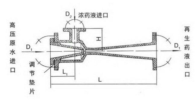 高壓原水通過管道閥門]進(jìn)入噴射器的漸縮段,將靜壓頭轉(zhuǎn)換成動能,在噴嘴處成為高速射流,使混合室形成微真空狀態(tài)將高濃度的再生液吸入混合室,并使再生藥液的壓力和速度發(fā)生變化;在混合段內(nèi),水和藥液得到充分地混合,然后注經(jīng)擴(kuò)散段,使再生液減低流速,靜壓頭升高,再通過出口管道及閥門將稀再生液送到交換器本體中。